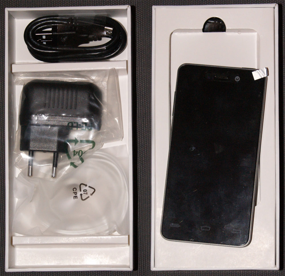 Под подложкой аккуратно уложены гарантийный талон, краткое руководство на русском языке, зарядное устройство, провод micro-USB, и почему-то, белые наушники. На экране телефона приклеена защитная пленка, и что очень приятно, у нее есть хвостик за который ее можно снять, не придется мучиться и ногтем ее поддевать.