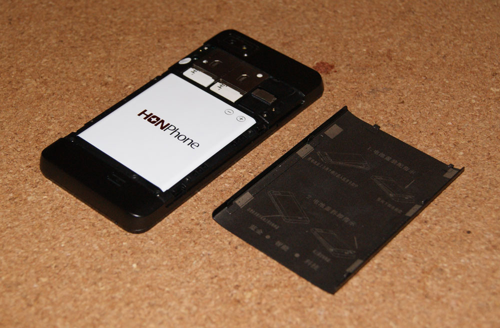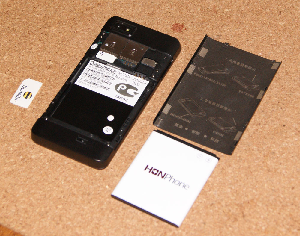 Чтобы снять заднюю металлическую крышку Changhong W20 нужно приложить определенные усилия, не смотря на то, что есть специальное место за которое крышку можно подцепить. Под крышкой все стандартно: съемная батарейка емкостью 2000 мАч и слоты для установки сим карт (нормального размера) и карты памяти.