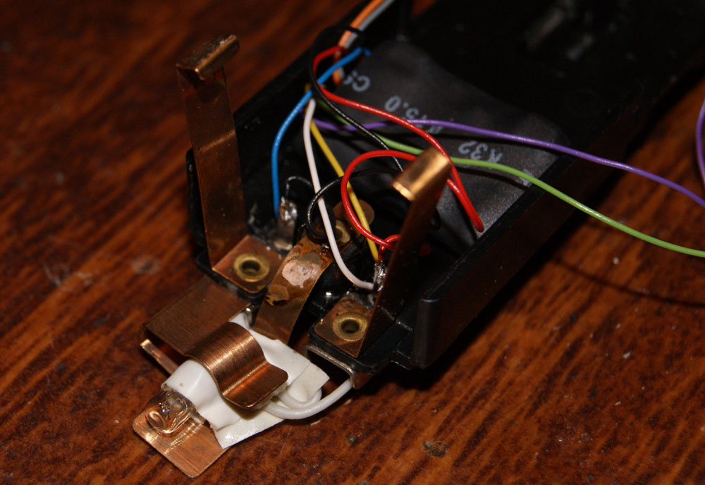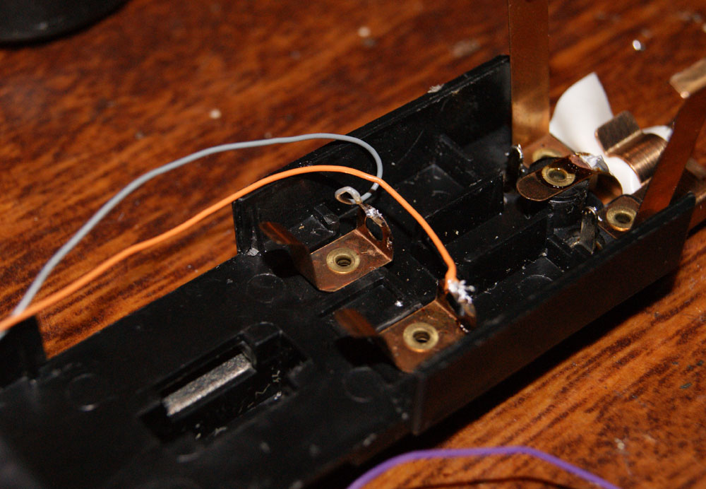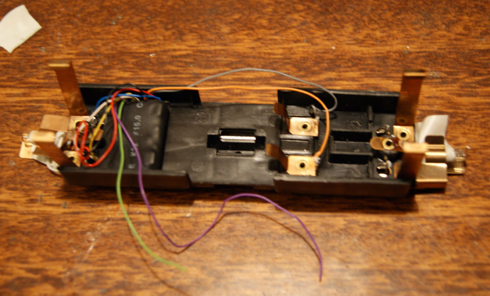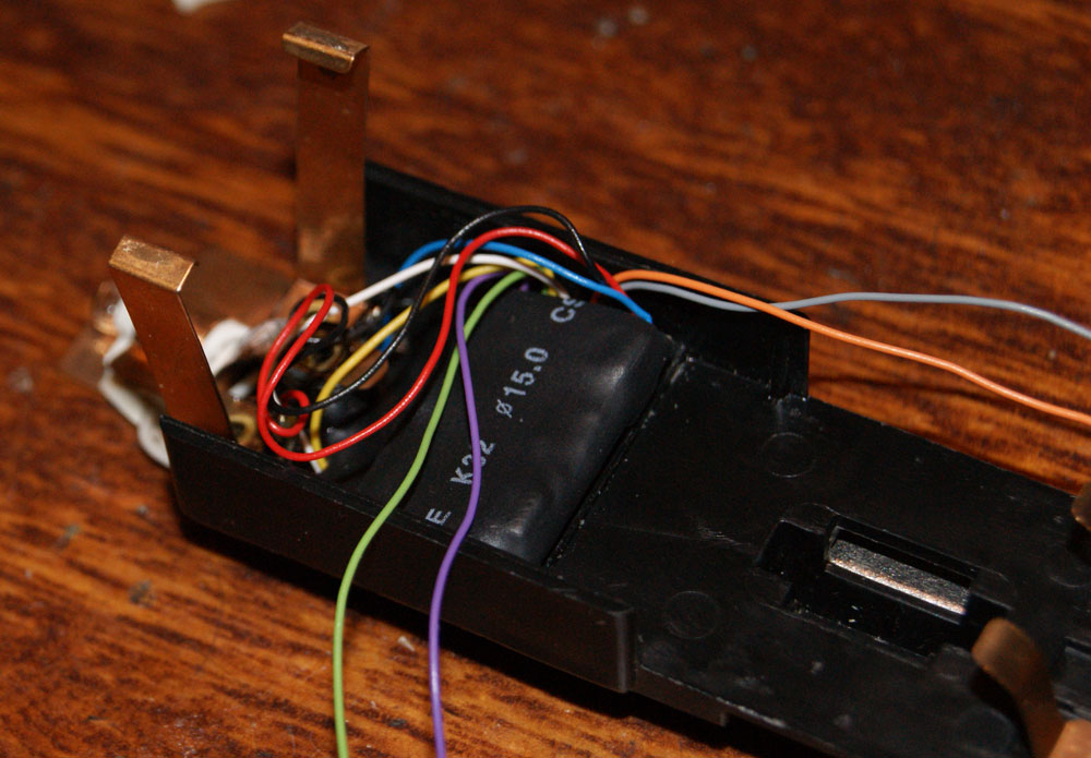 Привод двигателя также реализуется через имеющиеся контакты, проводки от декодера вполне хватает для этого. И, кстати, в отличие от распространенного мнения, что при переводе на цифровое управления старых локомотивов необходима замена мотора, мне менять его совсем не потребовалось, модель чувствует себя отлично, звук при движении не сильно отличается от того что было на аналоговом.