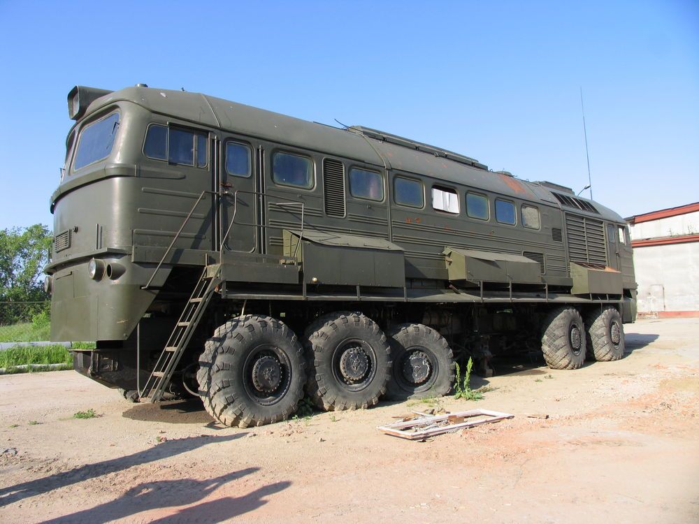 Верх этого чуда - бывший тепловоз ДМ62-1727 после ТР-3 в 2001 г., низ - шасси от пусковой ракетной установки на базе "Урагана" с увеличенной, по отношению к штатному варианту, шириной колеи. Привод колёс должен быть у каждого колеса индивидуальный (асинхронный электродвигатель, размещённый в ступице колеса и приводящий колесо во вращение через штатный планетарный редуктор). Для транспортировки приводом были оборудованы только 2 колеса, да и те не заработали. Привод поворота колес гидравлический с использованием каких-то непонятных исполнительных механизмов. В кузове установлена гидравлическая станция - именно из-за неё оно и не уехало. Ящики на боках - аккумуляторная батарея и ёмкость масла для гидравлики, ёмкости под рамой - топливные баки.